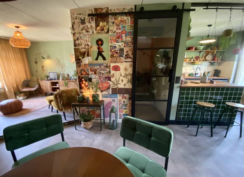 Wel koos ik posters gebaseerd op het kleurenpalet dat toegepast is in de rest van de ruimte(s). Met als basis groentinten dichtbij het groen van de muur. Ook voor de accesoires die erbij staan, weer om die rust te krijgen, ondanks de drukke posters.