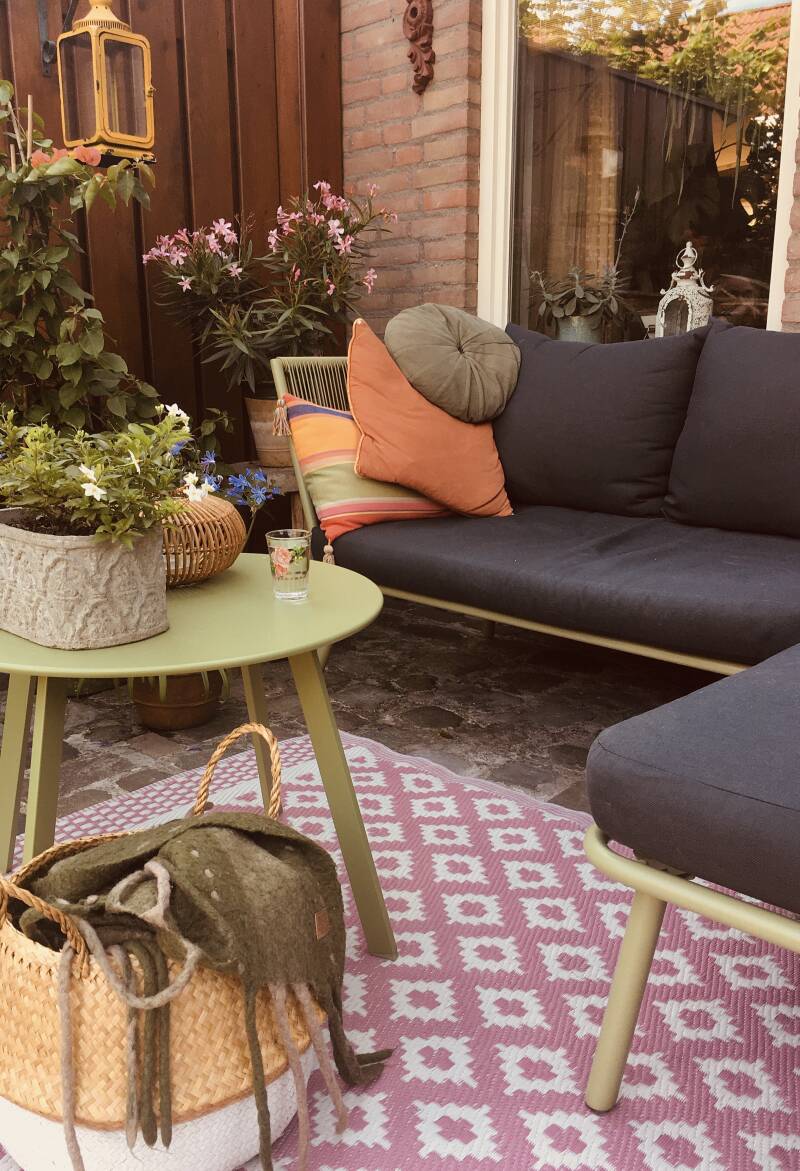 De stijl van binnen heb ik nu al doorgetrokken naar buiten. Qua kleuren en stijlcombinaties. De schuttingen heb ik dezelfde kleur gegeven als de binnenmuren. Zo maak je binnen optisch weer wat groter.
